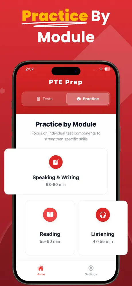 應用完整複現了PTE Academic的電腦考試環境,包含全計時的官方題型模組。你可以進行從口語寫作到閱讀聽力的全套模擬,提前適應考試節奏與壓力。